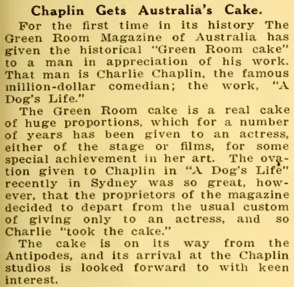 Editorial content. „Chaplin Gets Australia‘s Cake.