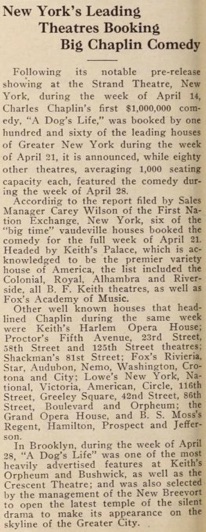 14, Charles Chaplin‘s first $1,000,000 comedy, A Dog‘s Life, was booked by one hundred and sixty of the leading houses