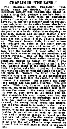 The Essanay-Chaplin two-reeler, „The Bank,“ came out