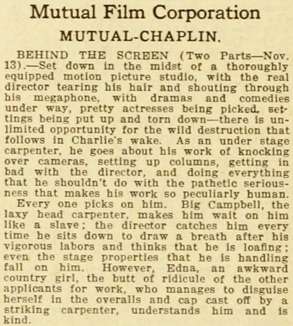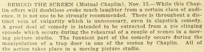 & BEHIND THE SCREEN (Mutual Chaplin), Nov. 13. – While