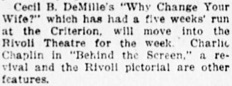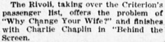 into the Rivoli Theatre for the week. Charlie Chaplin in „Behind