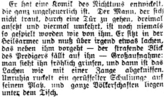 Er sitzt in der Heilsarmee und muß über irgend etwas lachen,