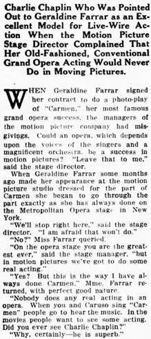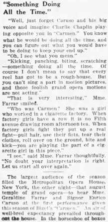 expressed by the musical critics the day following Miss Farrar‘s Charley-Chaplinized performance of Carmen.