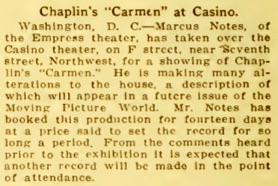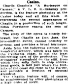 & CRANDALL‘S – Feature films – (...) Charlie Chaplin, in his latest picture, „Carmen,“ a burlesque on the films