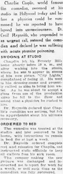 Editorial content. „CHAPLIN STRICKEN IN STUDIO