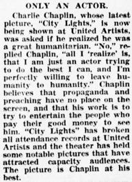 Charlie Chaplin, whose latest picture, City Lights, is now