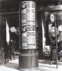& Strassenszene mit Plakat an Litfaßsäule „Weltkrieg