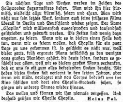 Redaktioneller Inhalt. „Gruss an Charlie Chaplin