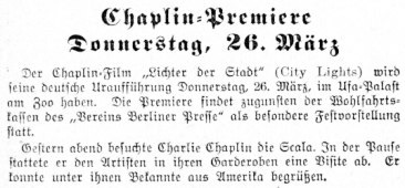„Gestern abend besuchte Charlie Chaplin die Scala“