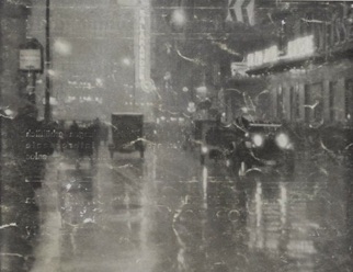 Großstadtstraße bei Regennacht, Lichtreklame „Salamander“