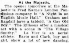 The opener tomorrow at the Majestic is Fred Karno‘s London Pantomime company in A Night in an English Music Hall.“ (...)