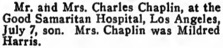 Mr. and Mrs. Charles Chaplin, at the Good Samaritan Hospital,