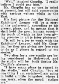 in Hollywood, and the studio will be built during Mr. Chaplin‘s