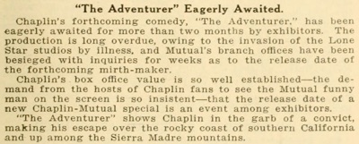 Chaplin‘s forthcoming comedy, The Adventurer, has been