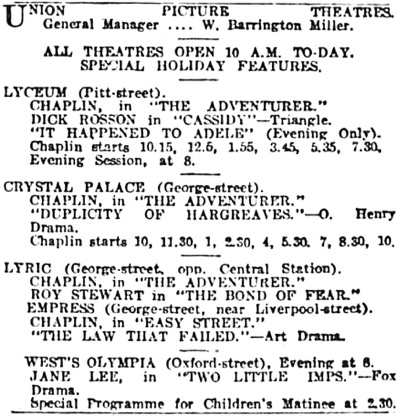 Chaplin starts 10.15, 12.5, 1.55, 3.45, 5.35, 7.30,
