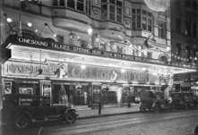 Lyceum Theatre, exterior by night, marquee CINESOUND TALKIES OPENING HERE SOON WITH WARNER BROS.