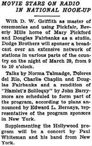Talks by Norma Talmadge, Dolores del Rio, Charlie Chaplin