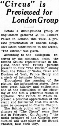 Chaplin‘s latest film, „The Circus,“ at York House last