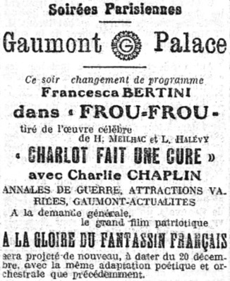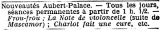 & Nouveautés Aubert-Palace. (...) Frou-frou; La Note de violoncelle (suite de Mascamor); Charlot fait une cure, etc.