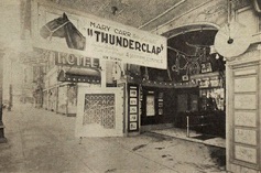 under the marquee, a cut-out sun, with Laura LaPlante in the centre, over the box-office and special boards at either side of