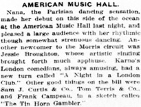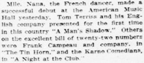 & Mlle. Nana, the French dancer, made a successful debut at the American Music Hall yesterday. (...) Others on the excellent