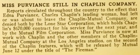 Reports circulated to the effect that Edna Purviance, Charles Chaplin‘s leading lady, had left or was about to leave