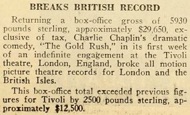 „In Britain ,The Gold Rush‘ opened at the Tivoli, Strand,