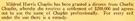 Mildred Harris Chaplin has been granted a divorce from Charlie