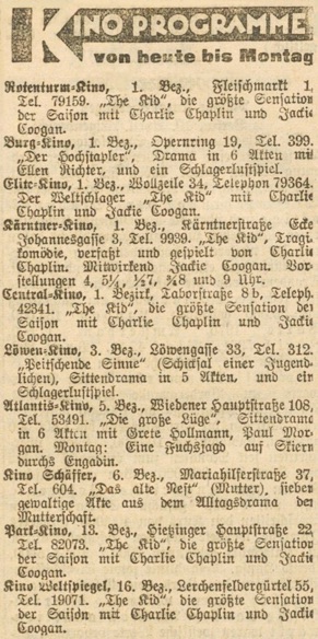 „Central-Kino, 1. Bezirk, Taborstraße 8b“ (...) „,The Kid‘,