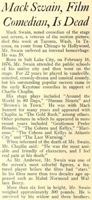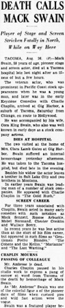 TACOMA, Aug. 26. (AP) – Mack Swain, 59 years of age,