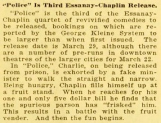 Editorial content. „Police is Third Essanay-Chaplin Release.