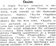 Charlie Chaplin‘s latest photoplay, Police, will be shown for the