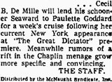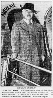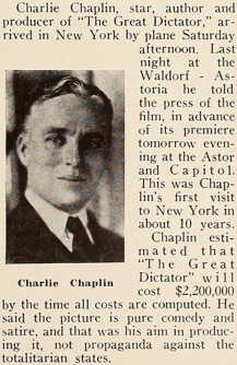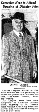 yesterday to attend the premiere of his new picture, „The Great Dictator,“ Tuesday evening.