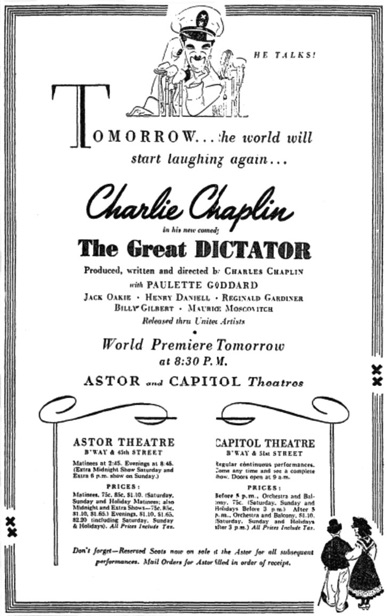 The Great Dictator world premiere is in New York Oct. 15, 1940