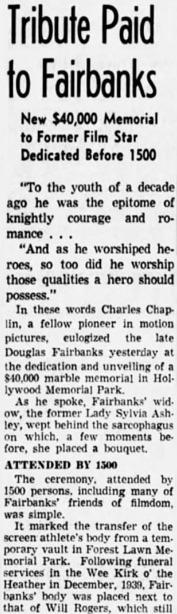 Douglas Fairbanks at $40,000 tomb in Hollywood Memorial