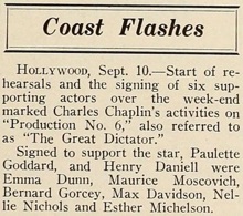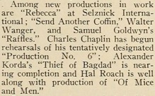& Among new productions in work are „Rebecca“ at Selznick International. (...) Charles Chaplin has begun