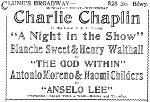 & Charlie Chaplin in „A Night in the Show,“ Clune‘s Broadway