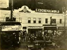 & Strand, exterior by night, sign Cockeyed World, Milwaukee