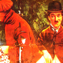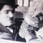 Sie schäkern. Er sitzt am Boden, ihr zu Füssen.
