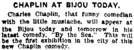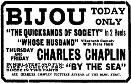 „All Charles Chaplin Pictures Appear At The Bijou First“