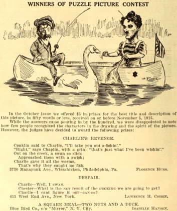 Drawing. In a canoe Charlie Chaplin and Chester Conklin. They