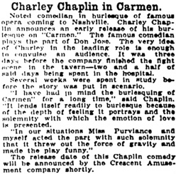 to Nashville. Charley Chaplin announces an early