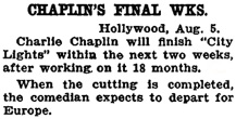 Charlie Chaplin will complete „City Lights“ this week.