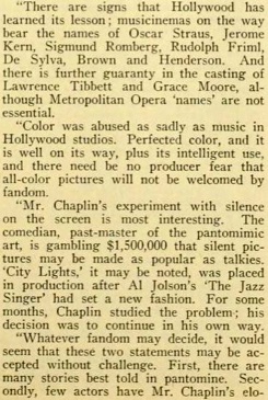 City Lights so charm picturegoers with its silence that the present supremacy of the talkies will be menaced?“ (...)