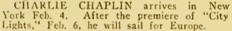 Editorial content. „Charlie Chaplin arrives in New York Feb. 4.