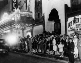 & Crowd waiting outside of the Los Angeles Theater