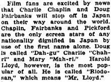 way around the world. Chaplin, Fairbanks and Pickford are