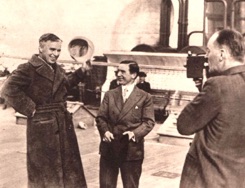 & Charles Chaplin greets the press and newsreel cameras aboard