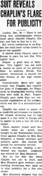 & SUIT REVEALS CHAPLIN‘S FLARE FOR PUBLICITY