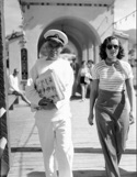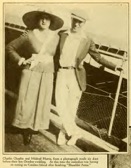Charlie Chaplin and Paulette Goddard stroll along the boardwalk